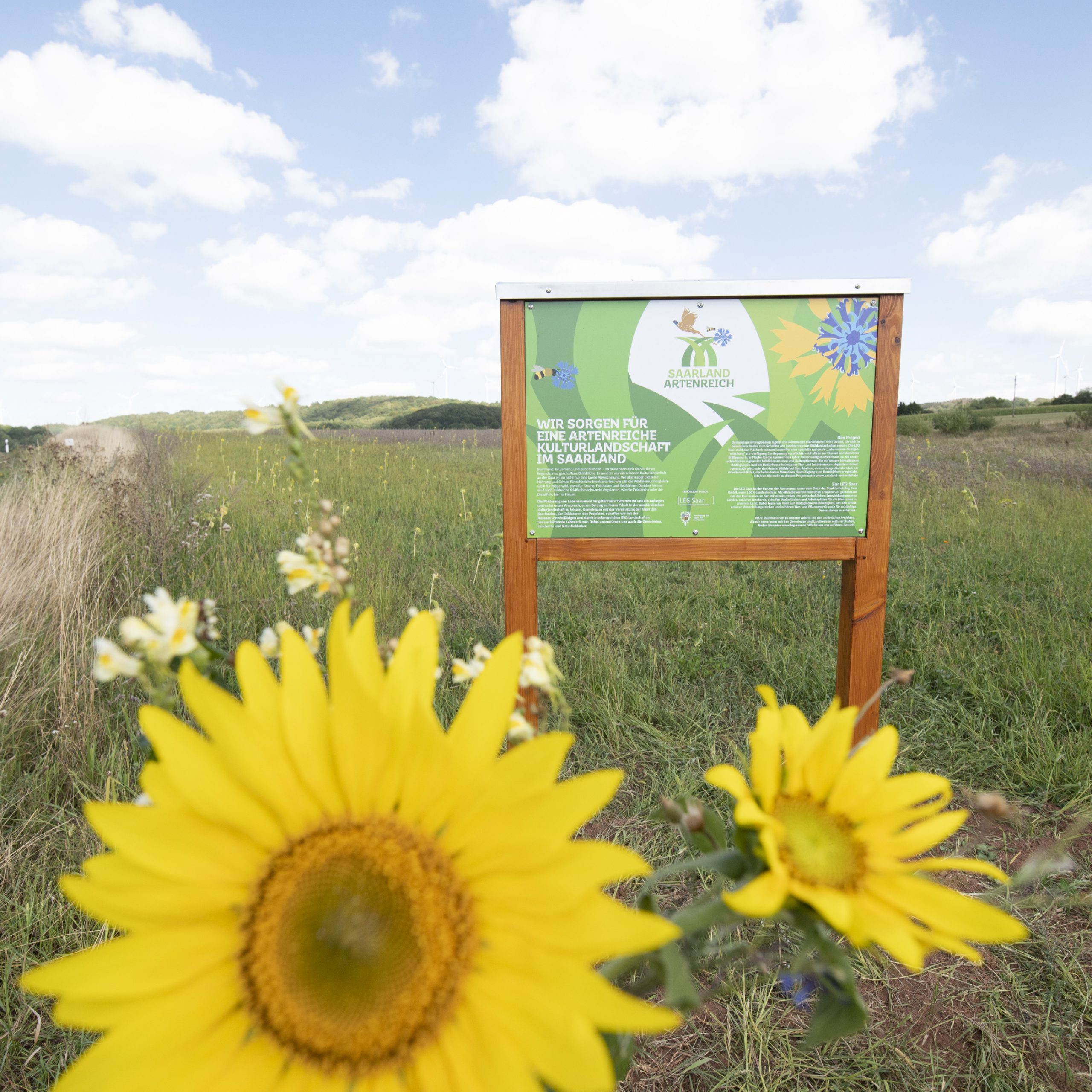 Für die LEG Saar sind Erhalt und Weiterentwicklung von Artenvielfalt wichtige Bestandteile der Landesentwicklung im Saarland. In der konkreten Umsetzung bedeutet das hier die großzügige Aussaat von speziellem auf Vielfalt angelegtem Saatgut. So entstehen neue Blühlandschaften mit einer großen Pflanzen-Bandbreite, die zahlreichen Tierarten Schutz und Nahrung bieten: dazu gehören viele Insektenarten, beispielweise die heimische Wildbiene und Schmetterlinge, aber auch Rebhuhn, Fasan, Hase und verschiedene Vogelarten, wie etwa die Feldlerche.