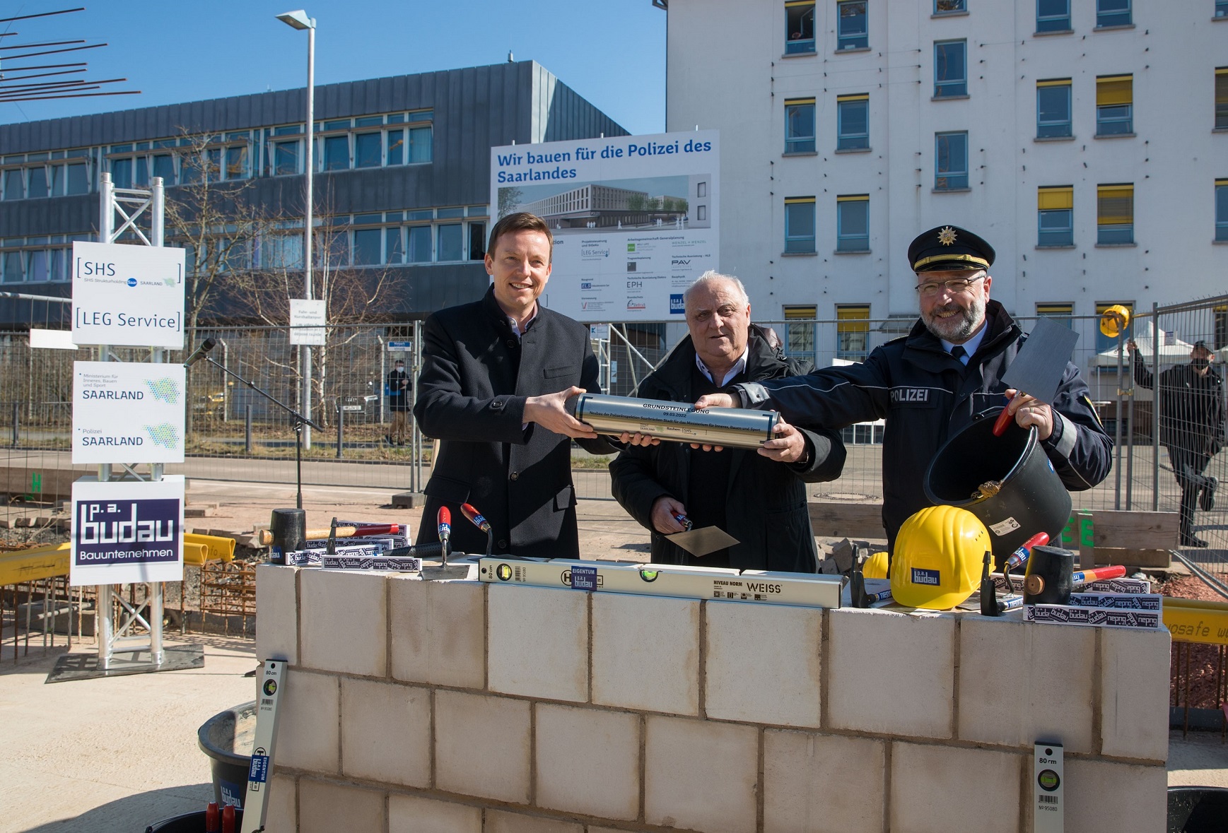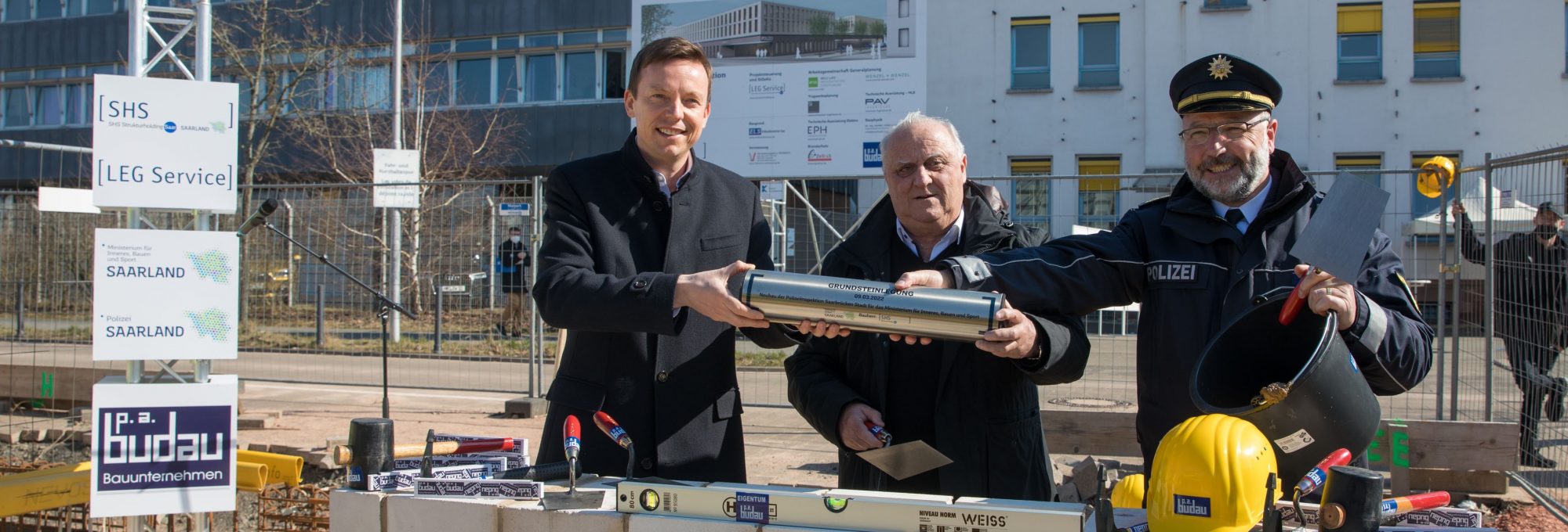 Am Mittwoch, 9. März 2022, hat Ministerpräsident Tobias Hans gemeinsam mit Bauminister Klaus Bouillon und Landespolizeipräsident Norbert Rupp anlässlich der Grundsteinlegung die Baustelle besucht.