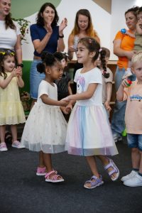Sie befinden sich hier: Startseite • Eröffnung der inklusiven Kita „Waldwichtel“ • Foto 3 Erzieherinnen und Kinder bei Bewegungslied
